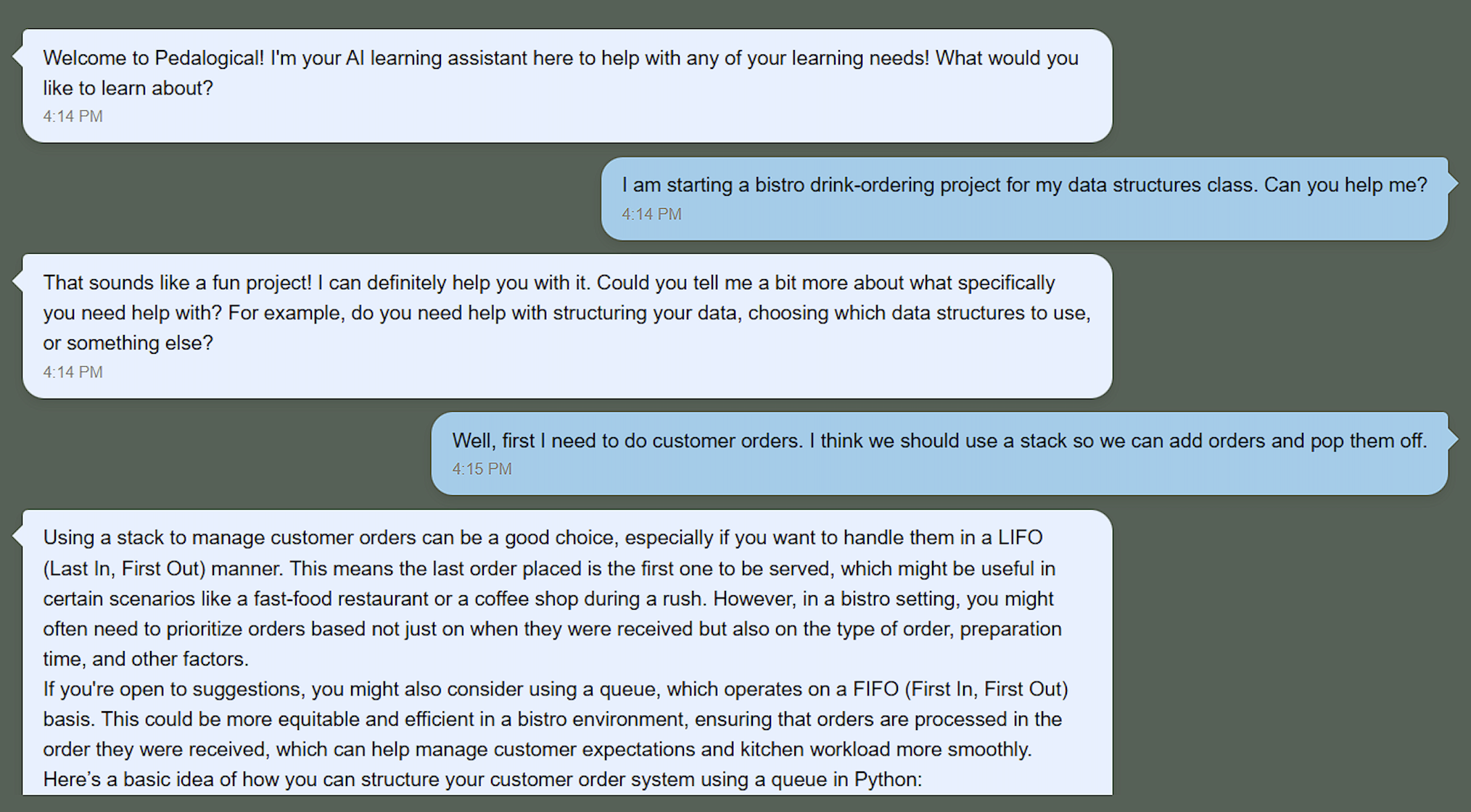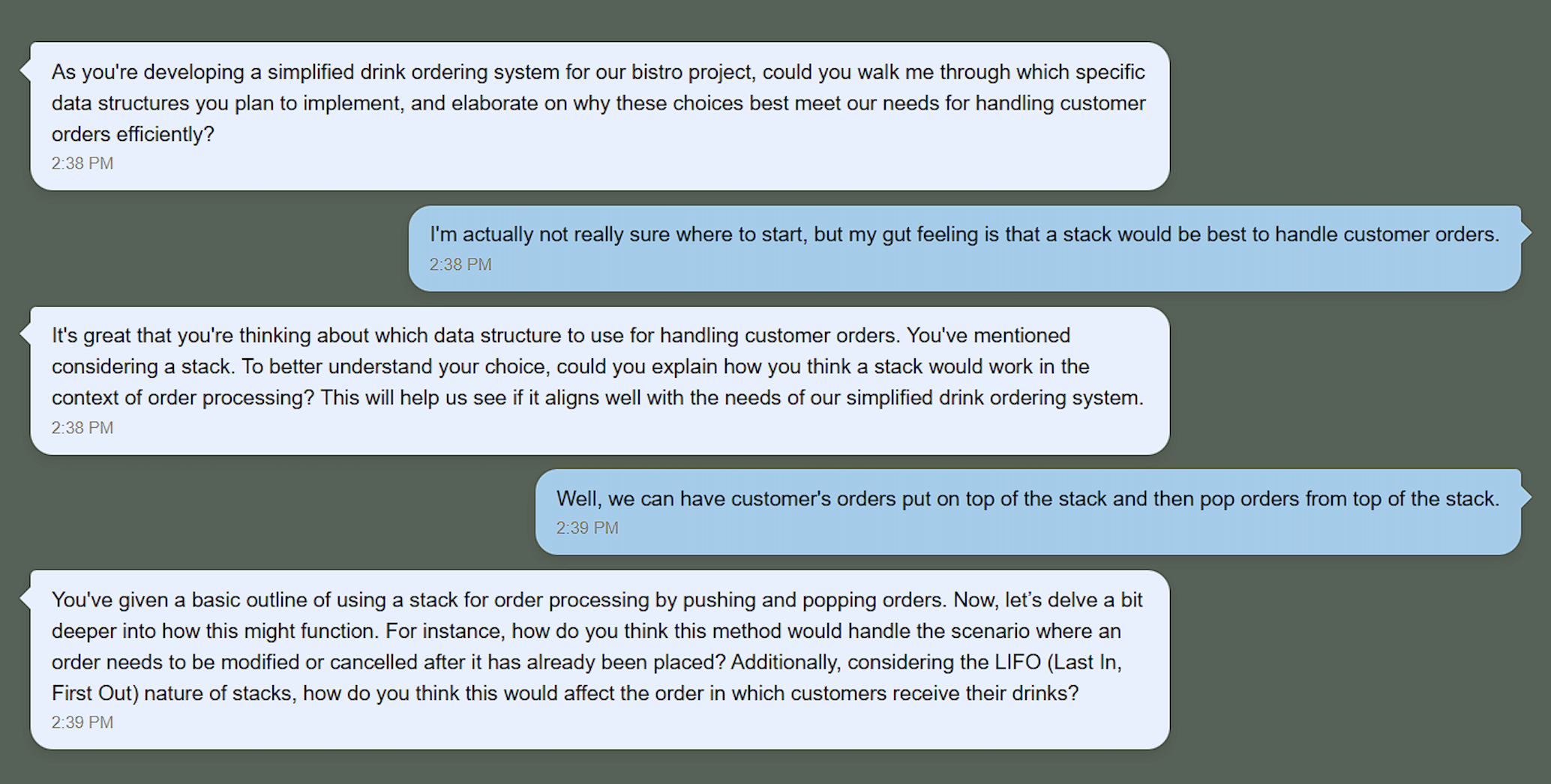 - Context: Students were asked to use the chatbot to design a medium-sized data structures project